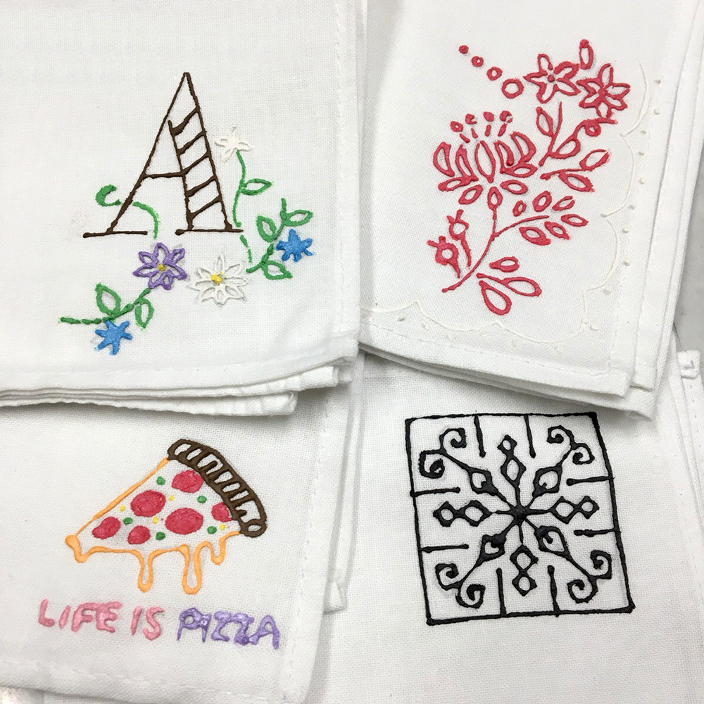 描きたい布に鉛筆やチャコペンで下絵を描きステッチカラーで着色し、乾かすと立体感のある刺繍風の作品に仕上ります。
