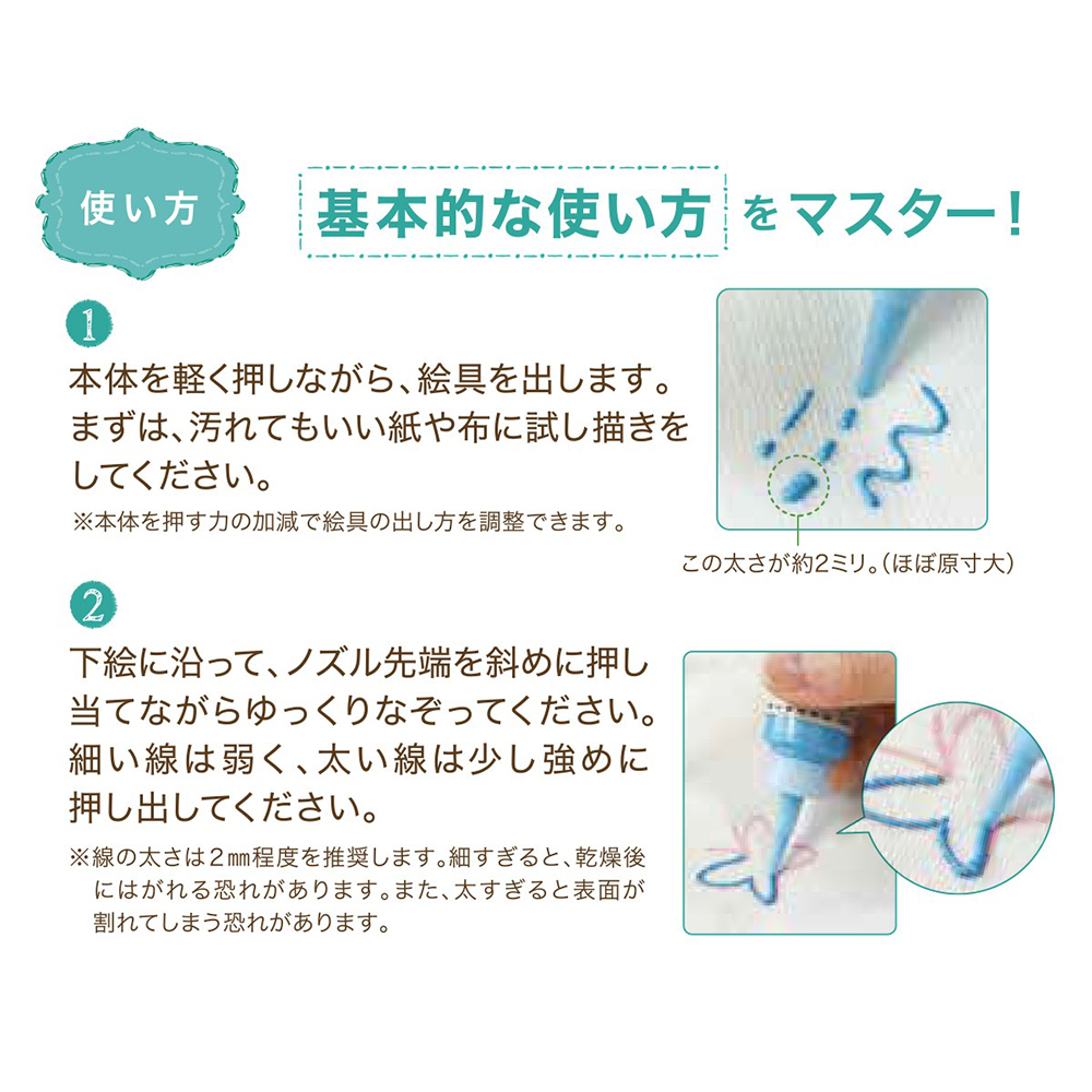 注意事項 | ◎線の太さは2mm程度をおすすめしています。 ※細すぎるとはがれる恐れがあり、太すぎると表面が割れる恐れがあります。 ※乾燥時間は3時間以上、洗濯する場合は1週間以上乾燥させて下さい。 |