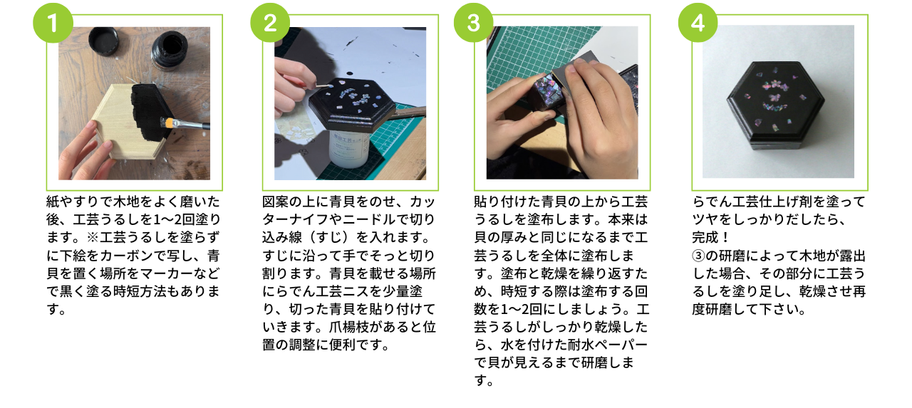 | 必要な道具と材料 | カッター、はさみ、接着剤、工芸うるし、木地素材(箱、お盆など)やジュピーライト、刷毛、耐水ペーパー |