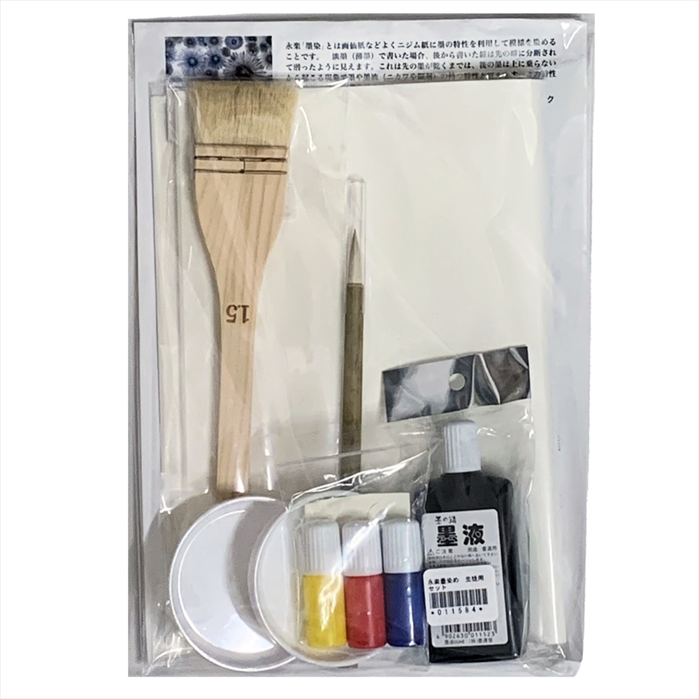 セット内容 | 墨液(黒60mL)、彩液(青・赤・黄各5mL)、墨染め用和紙257×364mm10枚、平刷毛45mm、小筆、絵の具皿80mm2枚 |