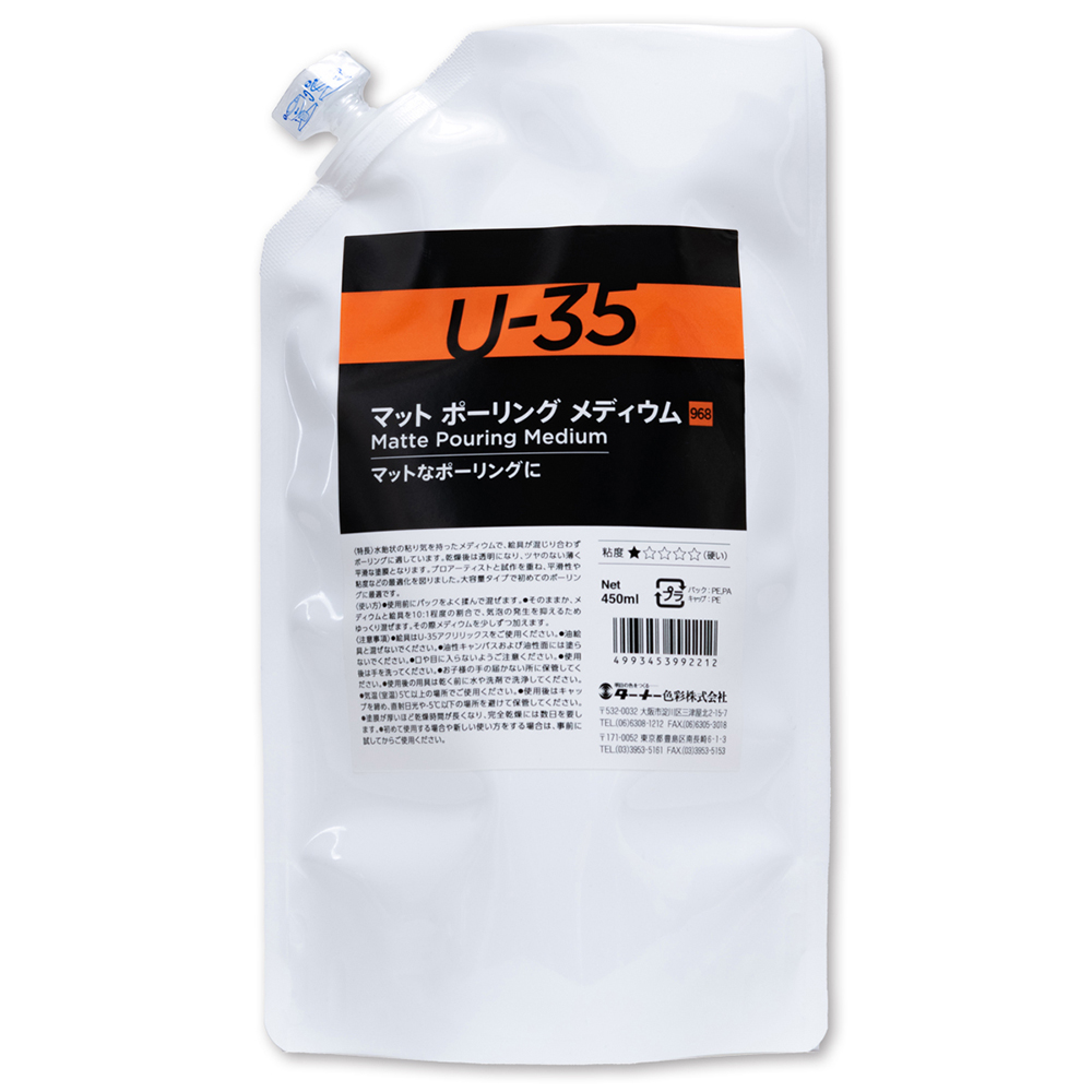 水飴状の粘り気を持ったメディウムで、絵具が混じり合わずポーリングに適しています。乾燥後は透明になり、ツヤのない薄く平滑な塗膜となります。プロアーティストと試作を重ね、平滑性や粘度などの最適化を図りました。大容量タイプで初めてのポーリングに最適です。