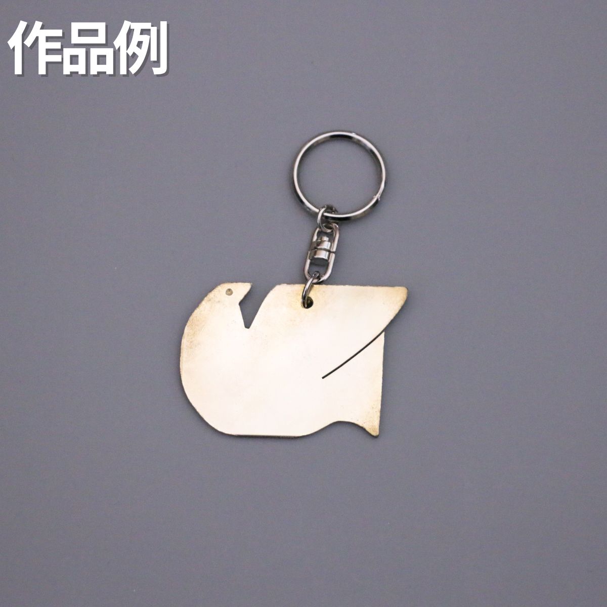 真鍮ペーパーナイフと同様に、真鍮板に描いた下絵に沿って糸鋸で切りだし、切断面をやすりがけして仕上げします。キーホルダーを取りつける穴をドリルであけて完成です。