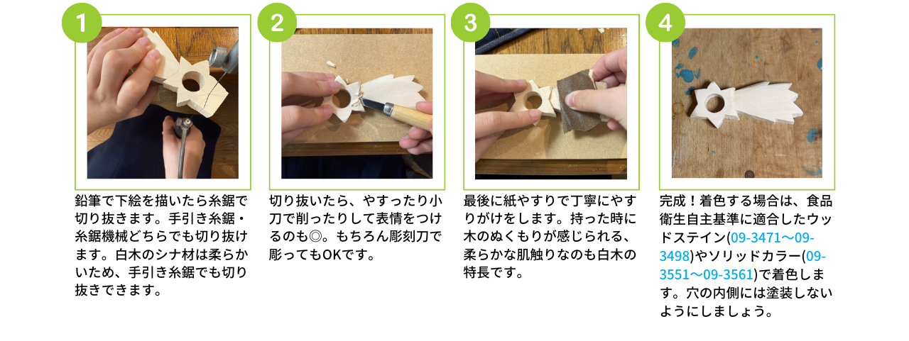 切ったり彫ったりの加工がしやすいシナ材で、ワックスなどの着色もきれいに映えます。