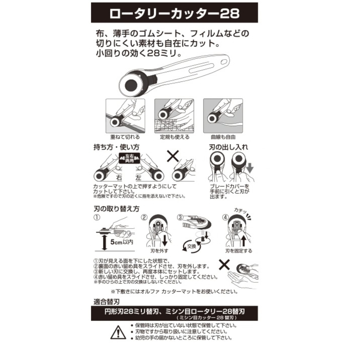 小回りのきく直径28mm円形刃を装着したロータリーカッターです。 布や紙をはじめ、薄手のゴムシート、フィルムなど切りにくい素材も自在にカットできます。 ワンタッチで替刃の交換が可能です。