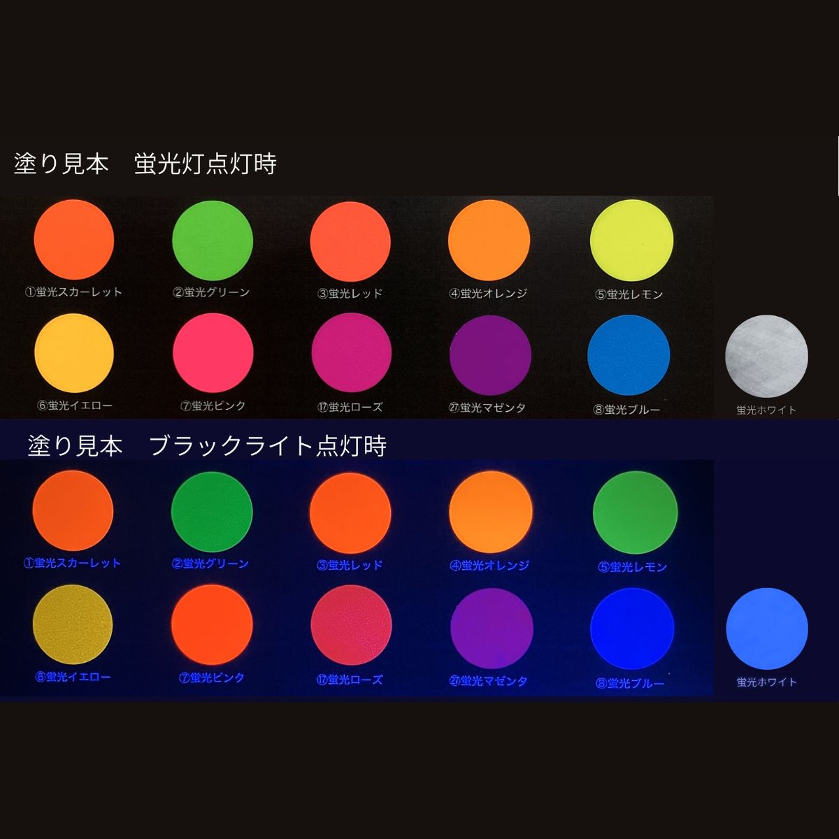 マゼンタとブルーはブラックライト点灯時に発色が他の色より暗く見えます。